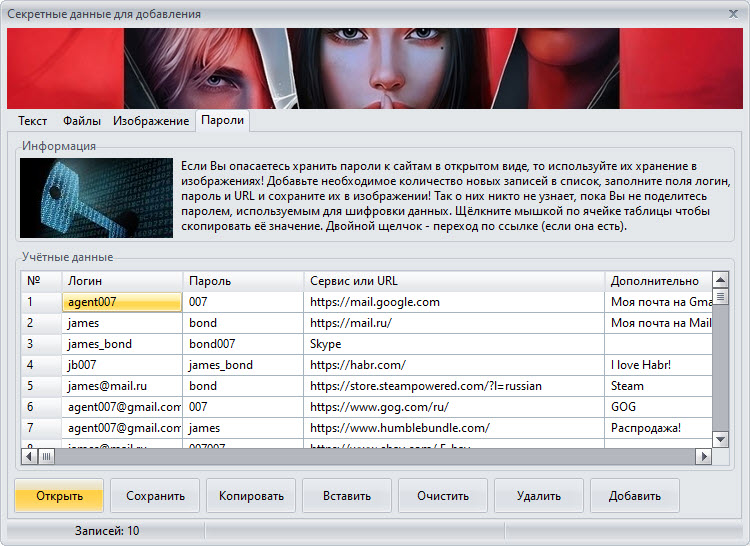 Если Вы храните секретную информацию в виде логинов и паролей к сайтам или другим системам, то можете спрятать её в JPEG изображении. Этот диалог позволит добавить новые записи или отредактировать их.