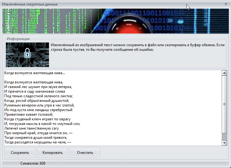 В случае, если была сохранена текстовая информация, то появится новое окошко с текстом. Этот текст можно скопировать в буфер обмена или же сохранить в файл.