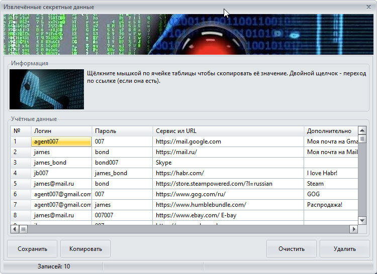 Если данные - это пароли, то Вы увидите таблицу с учётными данными. Их можно сохранить, скопировать в буфер обмена или использовать для доступа к сетевым ресурсам.