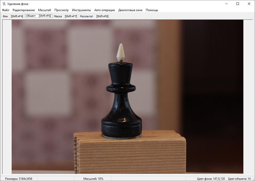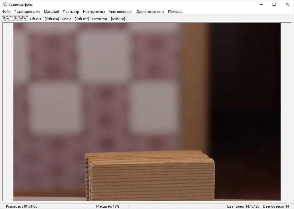 В этой вкладке можно видеть исходное изображение с объектом. С помощью меню просмотр можно вывести в нём также сглаженное изображение (используется при расчётах) фона.